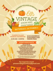 Come on down for the 6th Vintage Show and Swap Meet at the Pioneer Village Museum! Event include 50/50 draw, lottery basket, watermelon contest, farmers market, pumpkins for sale, and more! $2 admission.